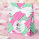And she's off to the altar! Tent style party favour box with a white ribbon closure features a lady in her Derby hat on the front with your message against a background of hot pink, green and white diagonal blocks of stripes. Fun bridal shower boxes or change the wording and use for a birthday party or any occasion. 3" wide x 1.5" long x 3.25" high. MATCHING items in our store.