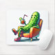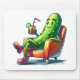 A smiling humanoid pickle sits in a red chair holding a beverage with a straw