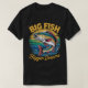 This black t-shirt features a vibrant and artistic illustration of a large fish, possibly a bass or trout, leaping out of the water. The fish is rendered in a variety of colours, including blue, green, yellow, and red, with detailed scales and fins. The words "BIG FISH" are printed in a bold, stylised font above the fish, and "Bigger Dreams" is printed below, also in a stylised font. The background shows a stylised sunset or sunrise over water. This design is perfect for fishing enthusiasts and dreamers alike.