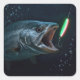 A large fish glides through the murky depths, its mouth agape as it nears a glowing neon lure, surrounded by swirling bubbles