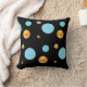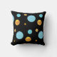 Beautiful throw pillow with big gold and turquoise polka dots on black background.