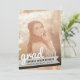 This modern graduation party invite design features a bold sketched/scribbled 'grad' script in white, tilted at a stylish angle at the bottom of the layout matched with simple typography on a black gradient overlaying a personalised photo of the graduate.