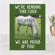 Greetings card with a funny horse message! We're sending this card big horse (because) we are proud of you. Image is a photograph of a white horse grazing in a field.