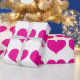 This fun wrapping paper features bright hot pink hearts on a white background.