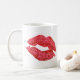 While drinking your coffee, tea or cocoa why not have fun with it? A pair of hug red lips is placed on this mug. Change up the background colour to real make it spicy and your style.