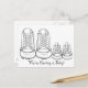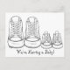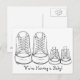 Postcard features a pair of adult-size sneakers next to a pair of child-size sneakers. Perfect for announcing your new arrival! Baby boy version (blue background) and baby girl version (pink background) and matching stickers also available. Text can also be customised for baby showers and birth announcements.