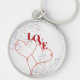 A beautiful and elegant round keychain featuring a modern 'LOVE' design with two charming red heart balloons and delicate multicolored confetti on a clean white background.
