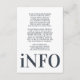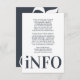 This ultra modern bold typography fantastic clean, tidy well designed minimal yet very playful bold info enclosure card is for any extra information for your events prior to the wedding ceremony, this information / details card & text placement in blue, grey and white for minimalistic style, however is customisable to other colours and is part of a unique suite and collection by Phrosne Ras Design. This would be great for those planning a fun black & white event, with this wedding enclosure card being bold and was inspired by fun-loving people who love a good party and don't mind straying from tradition.