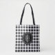 Impressive black and white buffalo check shoulder tote bag with a double-framed monogram circle. Easily change the stylish initials using the Template provided. Dimensions are 16" x 16" with a 28" strap. A larger 18" bag is also available. The exterior is 100% sturdy brushed polyester; interior is 100% polyester nonwoven laminate. Printed and then sewn for edge-to-edge designs. Made in the USA. See "About This Product" at side for additional information and care.
