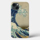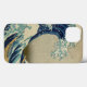A phone case with down to earth colours. A big dark blue, white and light blue ocean wave and a beige background.