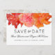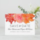 Orange hibiscus save the date wedding announcement for a Hawaiian tropical theme marriage. Three exotic hibiscus flowers of dark pink, light pink and orange make a wide border at the top of white cards with black text with space to include the full names of the couple.