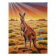 This striking artwork, executed in a stylized Indigenous art manner, features a red kangaroo standing prominently in a vast, arid desert under a starry sky illuminated by intense sun rays.