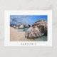 Postcard of the big rocks at the sand beach of Cala Mariolu, situated near Cala Luna the Gulf of Orosei on the island of Sardinia, Italy with a white border and the text: 'Sardinia'.