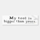 Need a gift for a woodturner, woodworker, or tool lover? How about a great gift for a mechanic or carpenter? Or a gift for the handyman (or wannabe) in your life?This funny bumper sticker pokes fun at the tendency of men to compare sizes of important pieces of equipment, shall we say? Tool sizes.It reads, "My tool is bigger than yours."Get one for the man with big tools in your life.Not that size matters. We all know it's how you handle your tool that counts!