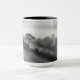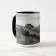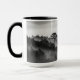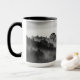 This black and white photo features a tree standing above the rest in a forest with fog.
