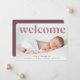 A sweet and elegant birth announcement design featuring a full bleed horizontal or landscape orientated photo with "welcome" overlaid at the top in retro block lettering. Your baby's name and birth stats appear along the bottom in dark charcoal. Add three additional square photos to the back, along with a personal message.