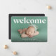 A sweet and elegant birth announcement design featuring a full bleed horizontal or landscape orientated photo with "welcome" overlaid at the top in white retro block lettering. Your baby's name and birth stats appear along the bottom. Add three additional square photos to the back, along with a personal message.