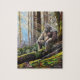 The legendary bigfoot, a.k.a. the Sasquatch, sits on a log in a forest taking a rest. A lone, abandoned hiking boot rests in the grass nearby.