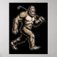 This detailed illustration depicts a muscular Bigfoot, or Sasquatch, confidently striding across the frame while carrying a golf club slung over its shoulder. The creature is rendered in shades of brown with intricate fur textures, showcasing its powerful build. Its expression is serious and focused, implying a determined walk on the golf course. The overall design captures a unique blend of mythical creature lore with the leisurely sport of golf, set against a solid black background.