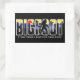 This sticker design sets bigfoot in the woods in the word BIGFOOT. The sun is setting and a big bright red ball in a yellow sky. The dark trees & blue mountains set as the backdrop. The silhouette of bigfoot in his famous walking position up front & outlined in white.