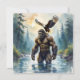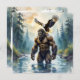 Bigfoot blank card. A muscular Sasquatch with an eagle landing on his shoulder while he wades through a river in a forest.