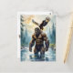 Bigfoot postcard. A muscular Sasquatch with an eagle landing on his shoulder while he wades through a river in a forest.