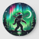 Unique round clock featuring a festive Bigfoot wearing a Santa hat, set against a vibrant aurora borealis scene adorned with night-time charm and evergreen trees under the crescent moon.