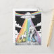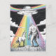 A funny Bigfoot and a unicorn looking up at a UFO that is beaming down rainbow light
