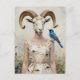 A surreal bighorn sheep woman in a dress made from birch bark with a bluebird on her shoulder fashion collage