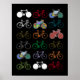A graphic illustration of colour bikes. A composition of Bicycles of different colours and styles on black