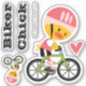 Show you love for cycling with these cute kiss cut vinyl cycling chick vinyl stickers that say biker chick. A cute yellow chick wears a pink helmet, black and white biker shorts, hot pink top and tennis shoes. 6 individual stickers: "biker" "chick", two chicks one large, one smaller, a heart and the copyright. Artwork © Chrissy H. Studios, LLC. All rights reserved.