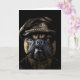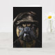 Badass biker pug puppy dog portrait. Reflected in his eyes is the face of a scared kitty cat. The black leather biker's cap says "No Katz".