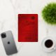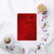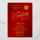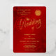 This modern Chinese wedding invitation features a real gold foil double happiness symbol and a calligraphic wedding headline on a shimmering red background. With a traditional Chinese text at the backside.