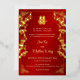 This traditional Chinese wedding invitation features a golden Asian frame, gold cherry blossoms and a golden artistic double happiness symbol on a shimmering red background. With a traditional Chinese text at the backside. This version has the parent's names in the headline.