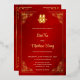 This traditional Chinese wedding invitation features a golden Asian frame and a golden artistic double happiness symbol on a shimmering red background. With a traditional Chinese text at the backside. This version has the headline: "together with their families"
