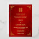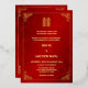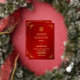 This traditional Chinese wedding invitation features a golden Asian frame and gold foil double happiness symbol on a shimmering red background. With a traditional Chinese text at the backside. This version has the parent's names in the headline.