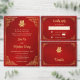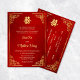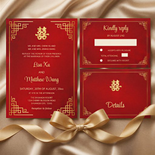 This traditional Chinese wedding invitation features a golden Asian frame and a golden artistic double happiness symbol on a shimmering red background. With a traditional Chinese text at the backside.
