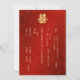 This elegant Chinese wedding invitation features an artistic gold double happiness symbol on a floral ruby red shimmering background. Bride and groom names in an elegant handwritten script. With a backside text in Chinese.