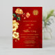 This traditional Chinese wedding invitation features a real gold foil and red double happiness symbol and painted orange apricot peonies on a red shimmering background. Bride and groom names in an elegant handwritten script in real gold foil. Chinese wedding invitation or tea ceremony invitation with a traditional Chinese text on the backside.