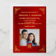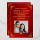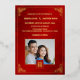 This elegant Chinese wedding invitation features a photo, a gold foil Chinese frame and round gold double happiness symbol on a floral ruby red shimmering background. With a traditional Chinese text at the backside. Chinese wedding invitation or tea ceremony invitation.