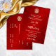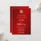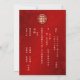 This minimal Chinese wedding invitation features a gold double happiness symbol on a floral ruby red shimmering background. Bride and groom names in an elegant handwritten script. At the backside is a traditional Chinese text. Chinese wedding invitation or tea ceremony invitation.