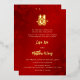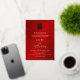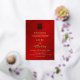 This elegant Chinese wedding invitation features an artistic real gold foil double happiness symbol on a floral ruby red shimmering background. Bride and groom names in an elegant modern handwritten script. With a backside text in Chinese.