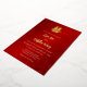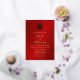 This elegant Chinese wedding invitation features an artistic real gold foil double happiness symbol on a floral ruby red shimmering background. Bride and groom names in an elegant modern handwritten script. With a backside text in Chinese.