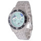 Has heft and feel of expensive stainless steel quartz watches. Good band with safety catch.  I removed links, which is easy because engraved arrows show direction to push the linking pins. As always by this seller, the image (a railroad logo) is a perfect reproduction of my emailed image, and is precisely spaced and aligned.
