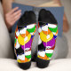 This fun Halloween socks are bright and colorful. The small print is crisp and shows the fun details. The softness of the socks feels nice on my feet and ankles. .