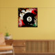 A grungy design of the cue ball behind a Billiards 8 ball.