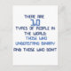 Binary joke - computer related. "There are 10 types of people in the world, those who understand binary, and those who don't"