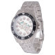 Has heft and feel of expensive stainless steel quartz watches. Good band with safety catch. I removed links, which is easy because engraved arrows show direction to push the linking pins. As always by this seller, the image (a railroad logo) is a perfect reproduction of my emailed image, and is precisely spaced and aligned.