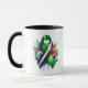 Coffee mug to help spread awareness for Bipolar Disorder with a black, white and green striped awareness ribbon and flowers. An inspirational quote with the words, "Hope is stronger than the storm..”