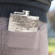 The flask itself is fine. It’s a cheap flask, obviously bought in bulk, however am prepared to overlook that. Given that it is a personalized item, I would have liked to have seen gift boxing instead of the generic packaging. Terrible printing, and/or quality. It’s a cheap, tacky vinyl. It is not cut straight and is also applied in a way that it is overhanging the bottom, causing the glue to catch on items and it will eventually roll and tear, damaging the wrap.